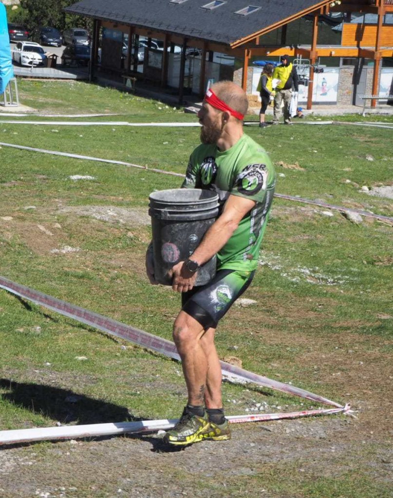 Aprieto lo que puedo hasta llegar al penúltimo obstáculo. La carga de Cubo. Una locura y muy temido por toda la comunidad espartana. Tengo muy cerca a mi rival, empiezo a llenar de piedras el cubo justo cuando él termina de llenar el suyo. Lamentablemente no me ve, se tropieza conmigo y cae él y su cubo encima de mi cuello. Por unos segundos quedo OUT. Pero sin tiempo que pensar mucho, vuelvo a llenar el cubo mientras él (que me pide disculpas, ha sido un incidente sin querer, cosas que pasan) ya sale a hacer la carga. Lo tengo a unos 15 metros y empiezo la carga. Pero rápidamente me doy cuenta que algo pasa, voy bastante mareado dolorido del cuello, algo que se le suma el dolor lumbar que esta carga produce. Una carga en ZigZag con 3 minicuestas que se hacen muy muy duras. No sé ni cómo lo hago sin parar porqué voy bastante out incluso con vista algo nublada del impacto, la intensidad y el no poder parar. Al fin dejo la carga y encaro la última subida corriendo tanto como puedo para tratar de alcanzarlo, pero tengo claro que si no falla en el último obstáculo, no podré alcanzarlo.