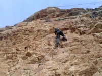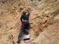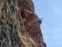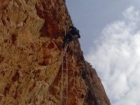 Nos preparamos. Cascos, arnés y algo muy importante: mi nueva GO PRO 3!!! Lista para estrenar en un día tan señalado. Olga y yo hablamos, analizamos un poco la vía y empiezo la subida. Ya el primer tramo empieza duro, físico, con desplomado y clavijas muy separadas para subir. Es duro, pero sobretodo hay que tener la cabeza muy fría para no ponerse nervioso ante la dificultad, pues si estas bien preparado siempre hay un camino o una forma para ir subiendo. Muy vertical, al principio con peldaños, después clavijas y alguna cadena.