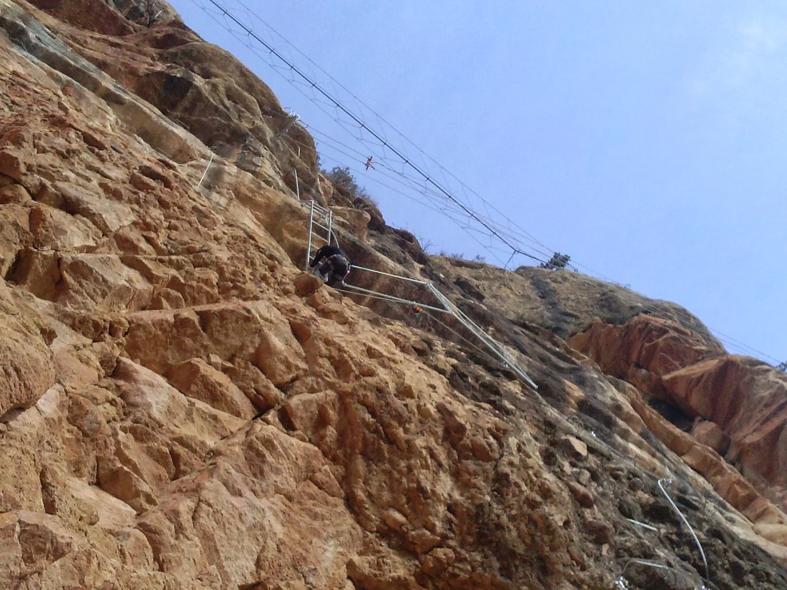 Superada la escalera, sigue subiendo vertical, otro desplomado para llegar al Puente. Después de cruzar el puente la Ferrata ya casi termina.