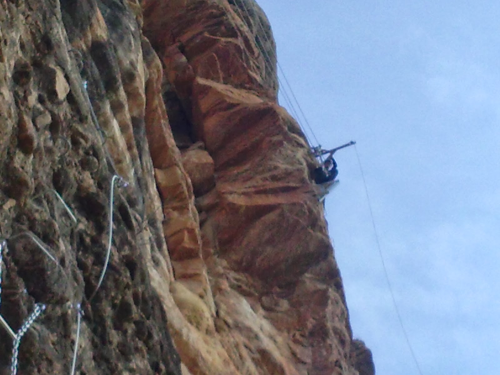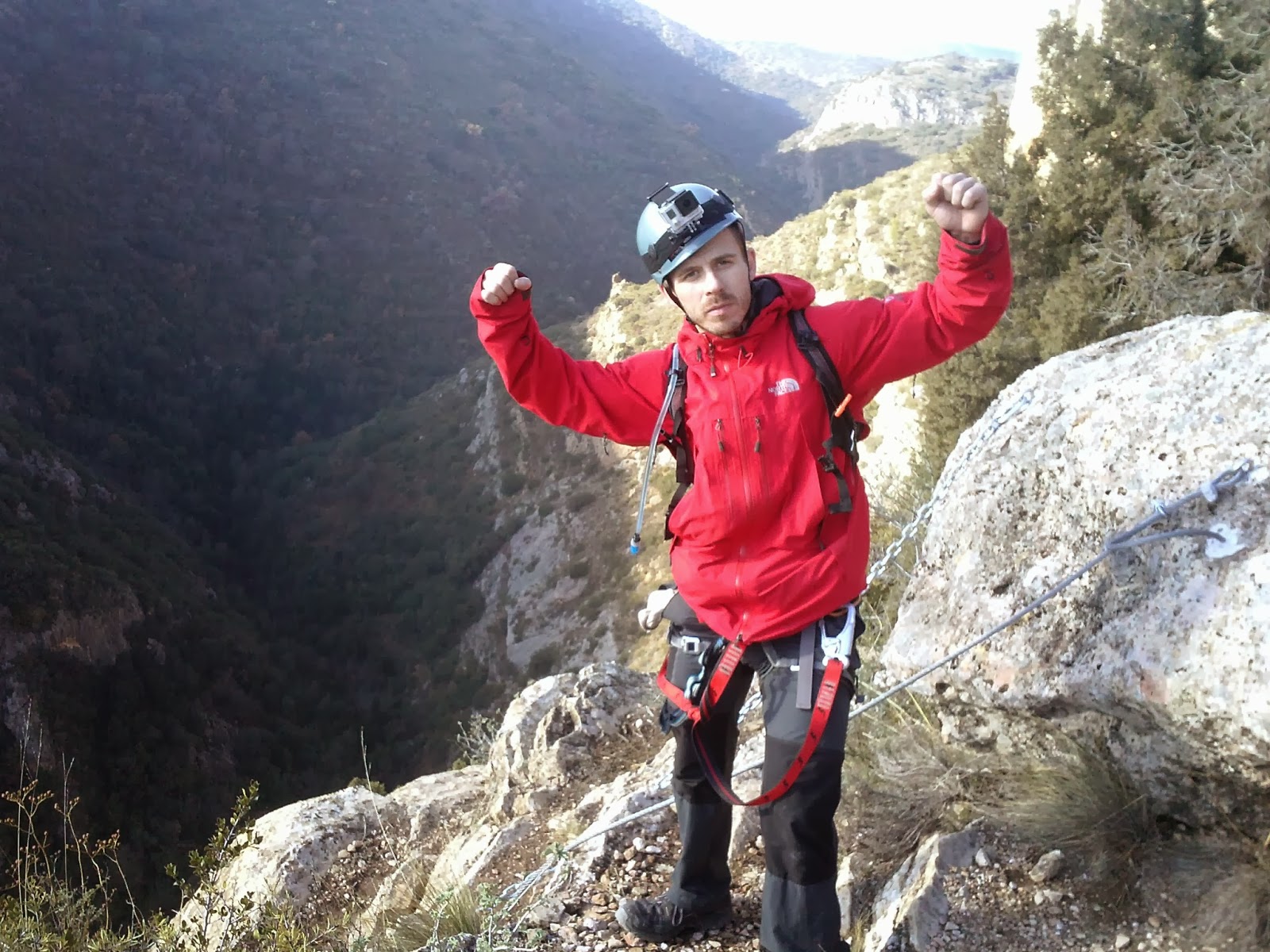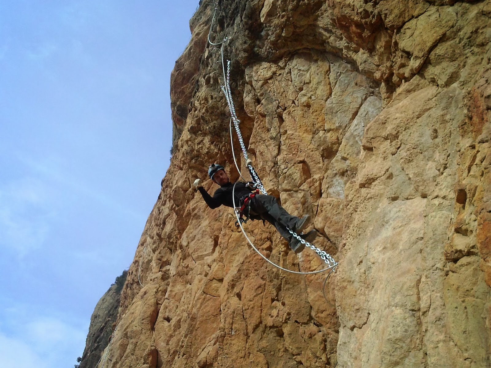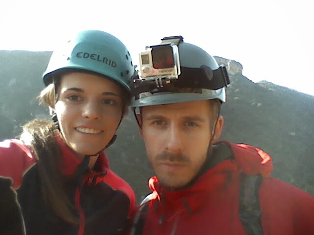 Nos preparamos. Cascos, arnés y algo muy importante: mi nueva GO PRO 3!!! Lista para estrenar en un día tan señalado. Olga y yo hablamos, analizamos un poco la vía y empiezo la subida. Ya el primer tramo empieza duro, físico, con desplomado y clavijas muy separadas para subir. Es duro, pero sobretodo hay que tener la cabeza muy fría para no ponerse nervioso ante la dificultad, pues si estas bien preparado siempre hay un camino o una forma para ir subiendo. Muy vertical, al principio con peldaños, después clavijas y alguna cadena.