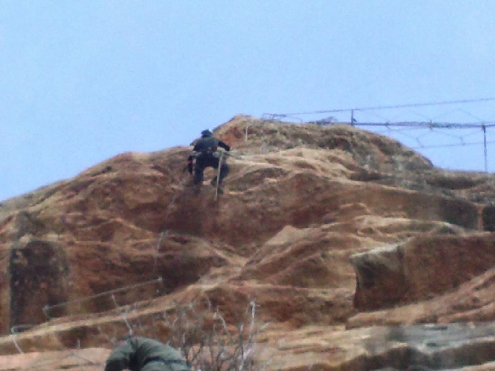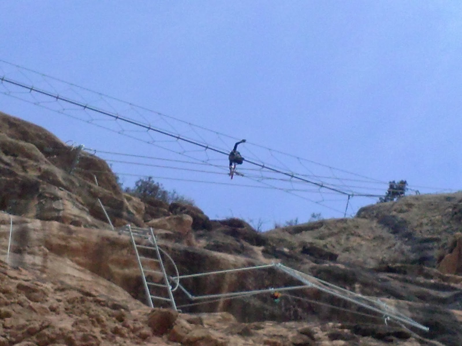 El tramos nuevo ya empieza interesante. Una pared horizontal que hay que superar con pequeñas presas de escalada en rocódromo. No duro pero si entretenido. Hay que ir con cuidado y buscando buena técnica. Al superar este tramo debo bajar unos metros y hacer otro tramo horizontal, bastante exigente de brazos, con pequeñas púas y me quedo colgado a más de 100 m del suelo. Ahora viene lo divertido y espectacular!!! Me sorprende gratamente por la ingeniosidad y la dureza del tramo. El desconocimiento de lo que viene e ir solo me hacen estar más en tensión. Pero preparado para cualquier obstáculo.