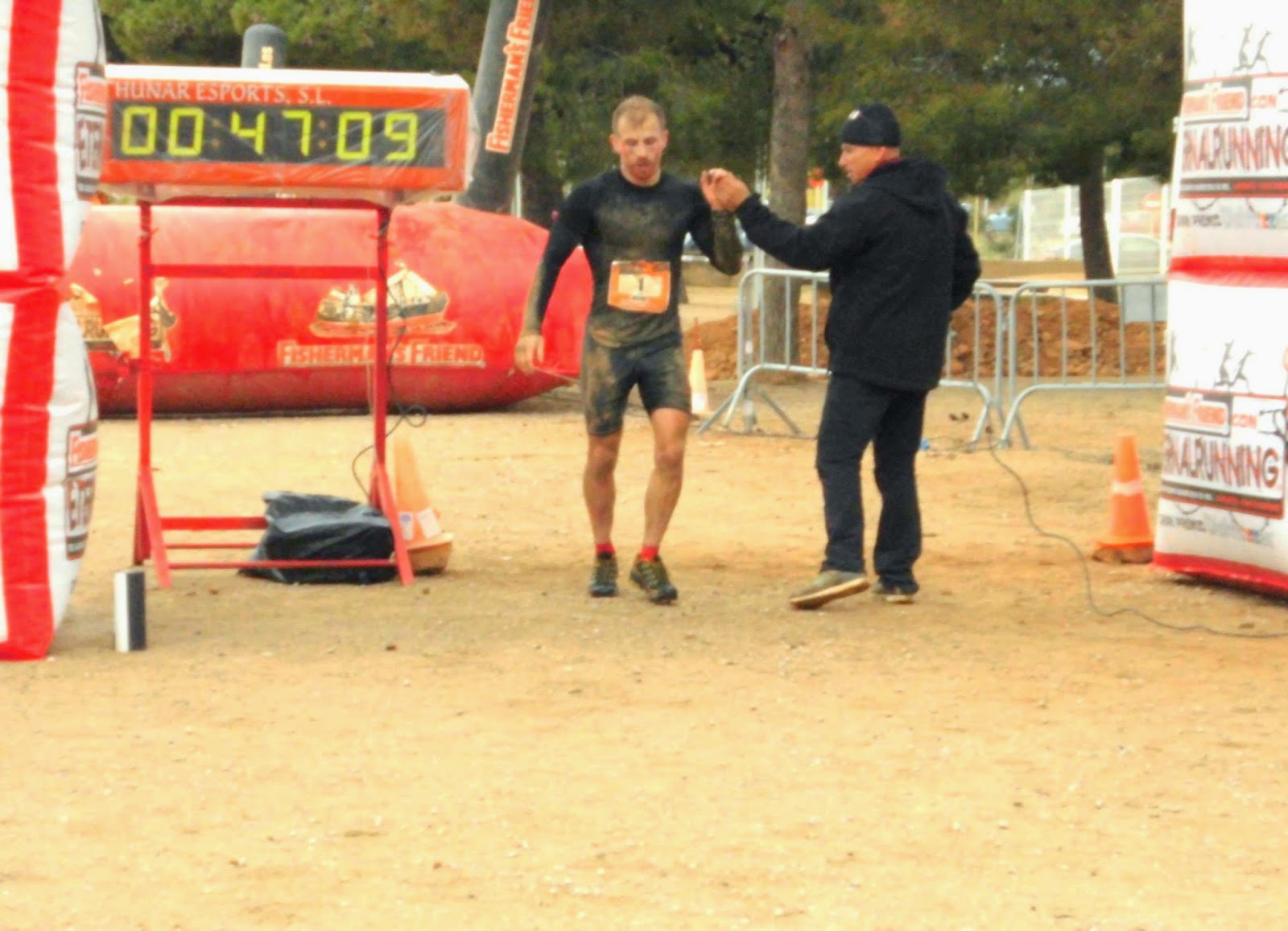 Sin mucho tiempo para recuperarme de la carrera de Burgos me traslado a la semana siguiente mucho más cerca, a Calafell (Tarragona). Esta vez acompañado de mucha gente cercana. Alumnos míos, amigos, família… Olga, Anabel y su pareja, MariaJosé, Dani Pérez y mi hermana! A parte de venirme a ver mi madre, Dani Buera y Jesús. Bien acompañado me presento a Calafell en un dia gris y lluvioso. Más recuperado de las anginas de la semana pasada pero aún sin sentirme en el punto de forma y muscularmente no recuperado al 100%. La carrera empieza a las 11 puntual y me lanzo a la carrera a buen ritmo con los 5 primeros. Hacemos una pequeña vuelta y unos pocos obstáculos colocándome 2º. Pasando por el pueblo de calafell atrapo al 1º y me pongo líder seguido muy de cerca de otro corredor, que ya conozco y sé que correr muy rápido en llanos. Al inicio la carrera es por asfalto y pistas de tierra llanas y con poca pendiente. Pronto entramos unos 3 kms por montaña, un tramo muy divertido y desde donde se aprecía el Mar que también tendremos que ir. Aunque me siento mejor los Isquiotibiales van algo forzados y decido no exprimirme al máximo. Salgo de la Montaña y vamos a la Playa. Un duro tramo por la arena de algo más de 1 kms hacen resentir más los Isquios pero aguantan y ya no queda mucho. En estre tramos me junto con el segundo y vamos juntos toda la Playa. Al salir de la Playa entramos en el Paseo Marítimo y nos acercamos al final. Apreto un poco al ritmo al escuchar la voz del Speaker y entro al circuito final de obstáculos sólo con apenas 10m de distancia con el segundo. Afronto los obstáculos a buen ritmo m uy animado por la gente que ha venido a verme y por toda la gente que me apoya y me anima. Entonces sin excusas debo hacer las cosas bien como un buen campeon de Eternal. Tengo una distancia de seguridad que me da tranquilidad para el triumfo pero quiero dar espectáculo. Así que me arrastro rápido por la pista americana y la ráfia, salto alto en los camiones y los contáiners, trepo por las balas de paja veloz… de esta forma cruzo la linea de meta como 1r clasificado con un tiempo de 47’11». 10 puntos más y mi primera victoria del año. Un profundo abrazo con mi madre es la manifestación de mi felicidad.
