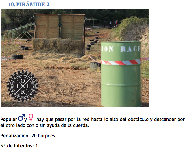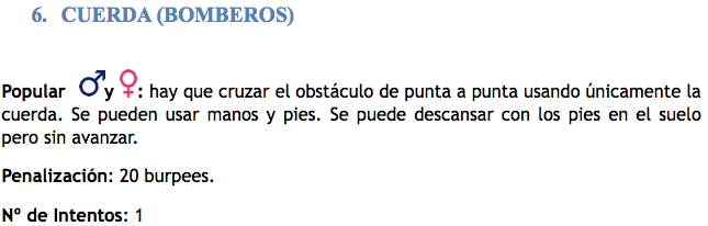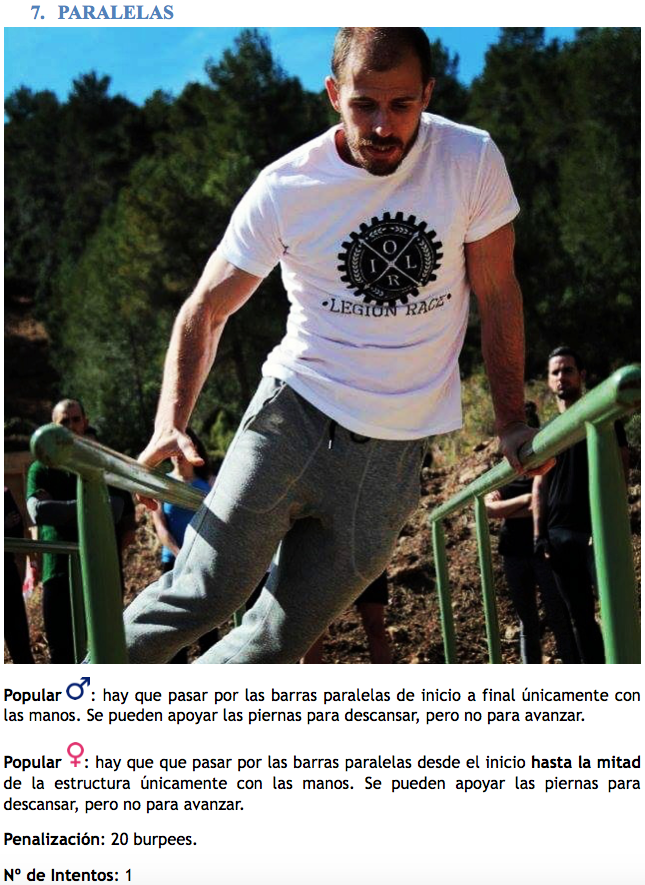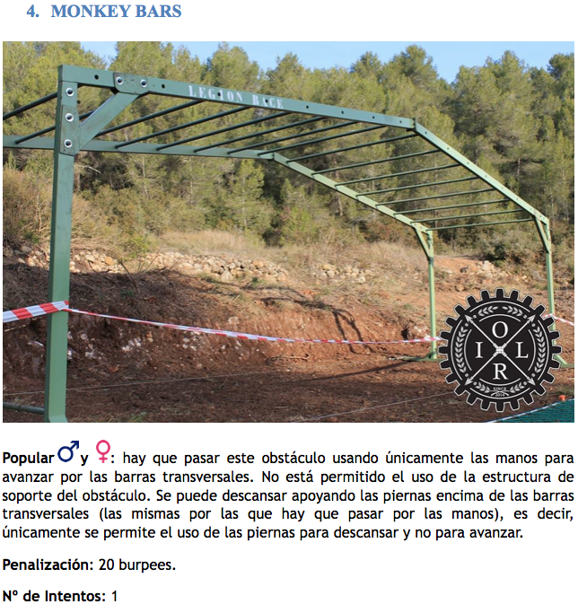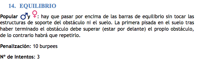 Cualquier obstáculo puede ser sujeto a una nueva normativa según el desarrollo de la prueba si lo considera oportuno la organización. En tal caso, siempre se comunicará al corredor con anterioridad. Al igual que pueden haber nuevos obstáculos de los que se informaría previamente.