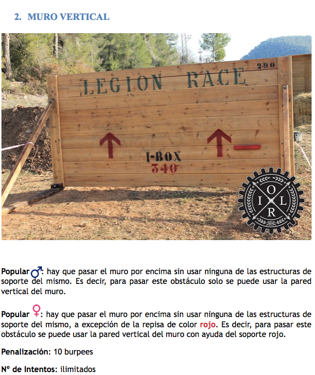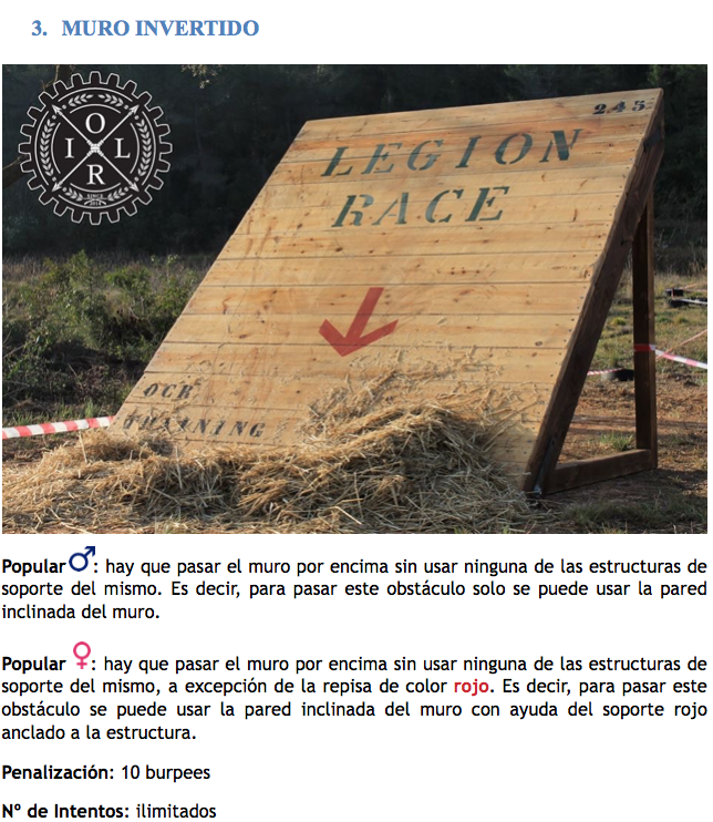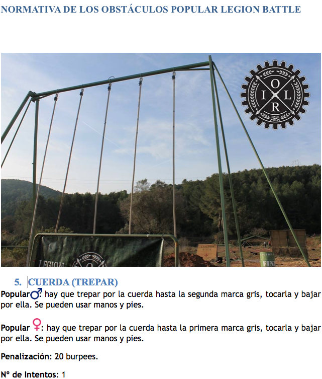 Todos los corredores de la Tanda Popular deben superar los obstáculos tal y como se rige en la normativa siguiente, sin ningún tipo de ayuda (ni externa ni interna). Habrá algunos obstáculos, que en caso de no ser superados, habrá que realizar una penalización específica del obstáculo y se podrá seguir con la carrera (¡ATENCIÓN al nº de intentos de cada obstáculo!). A pesar de la penalización o penalizaciones acumuladas por el corredor, su marca de tiempo al acabar la carrera SÍ se tendrá en cuenta para los tiempos finales y clasificación de Legion Battle Popular.