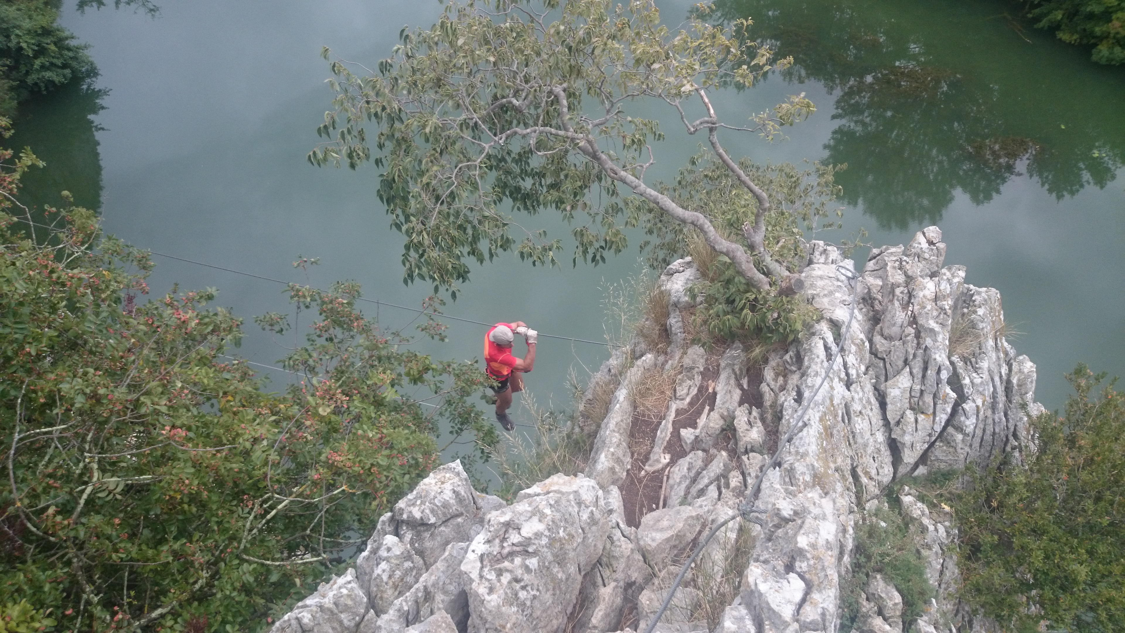 Elegir el paso de la cueva difícil vale la pena, para esto hemos llegado hasta aquí. Este paso lo catalogan como ‘Extremadamente difícil’ y de ahí que la graduación de la Ferrata sea de k5. Uno de los pasos más comprometidos de las ferratas francesas. Cojemos fuerza y arriba. El desplomado es espectacular y cogemos altura rápidamente. Una vez superado el desplome no hay descanso y hay que seguir a pesar de la posible fatiga de brazos un poco más adelante donde ya sí se puede descansar. Es en este punto donde puedes decidir si hacerla de nuevo bajándola, que es aún más difícil.